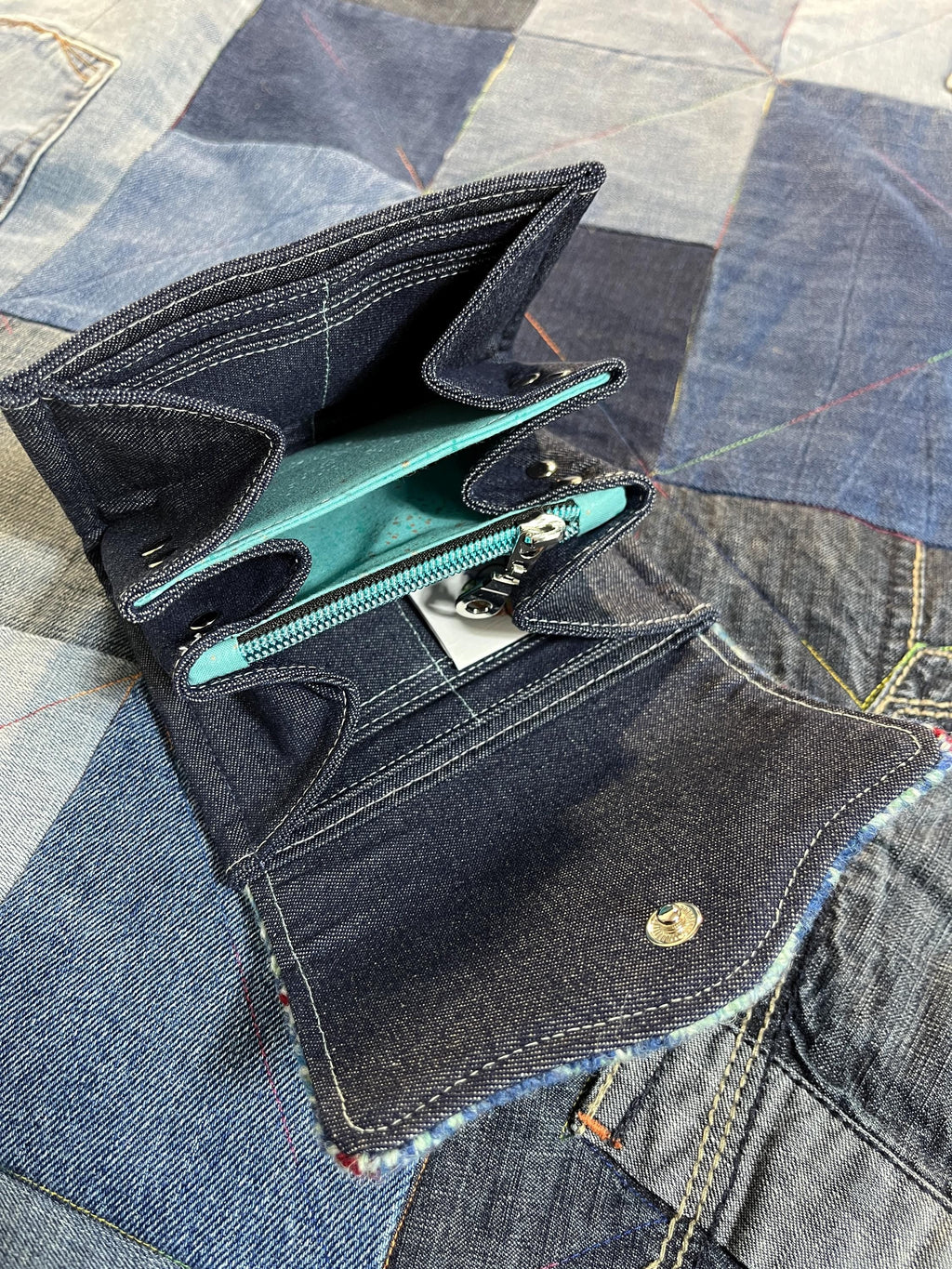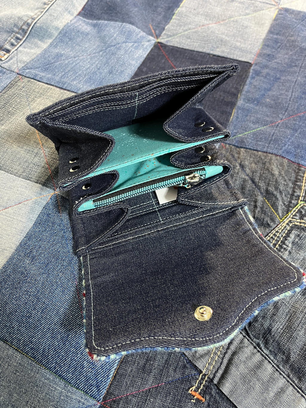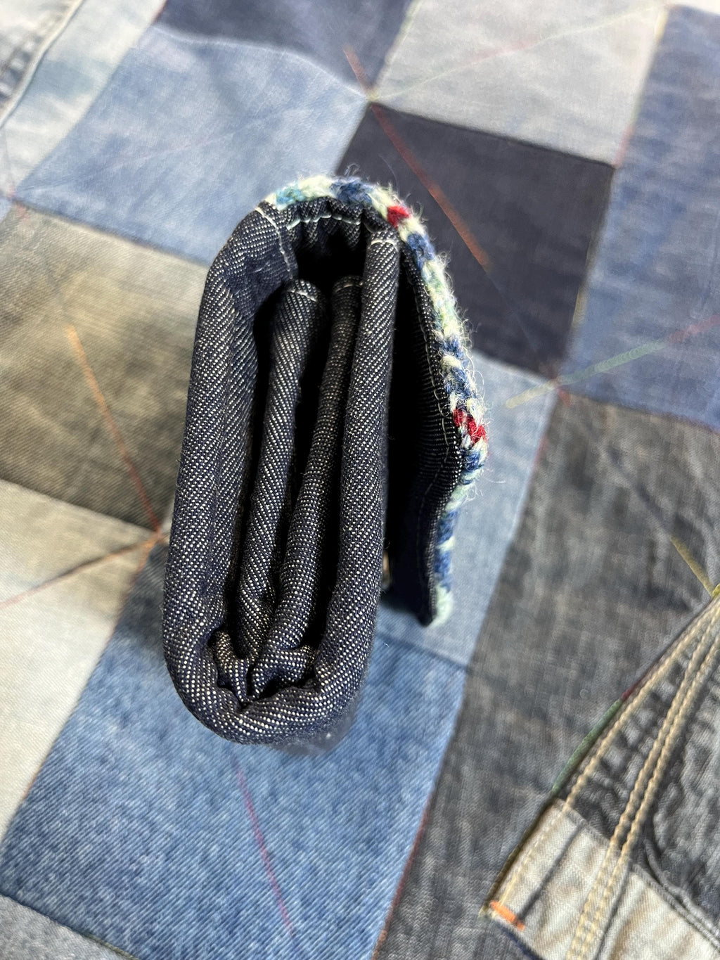 • For this particular purse the body is made from Cotton Denim and the interior from Woven Cotton. The interior fabrics have been especially chosen to complement and enhance the knitted flap design on the outside.
