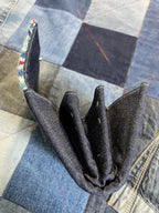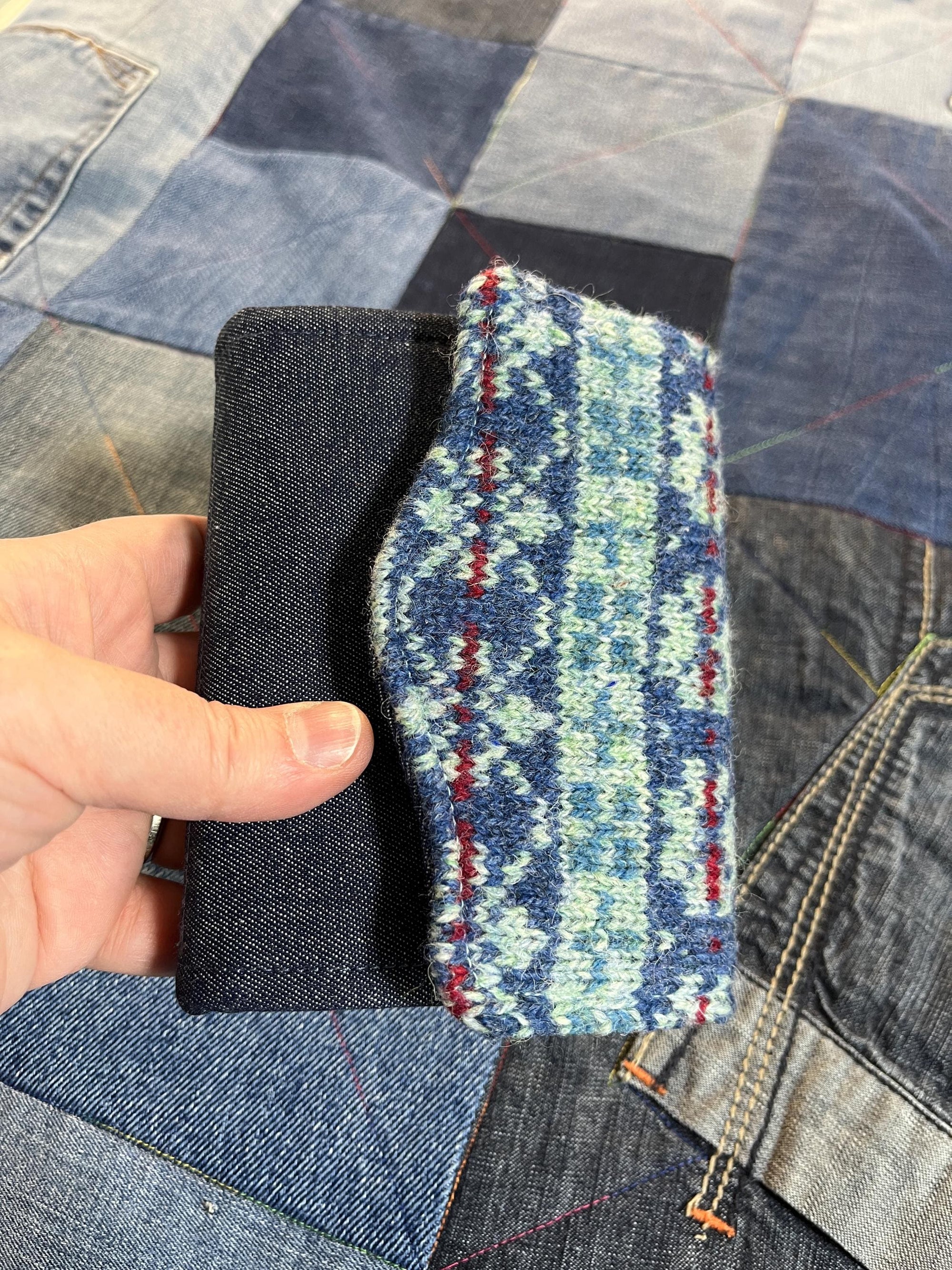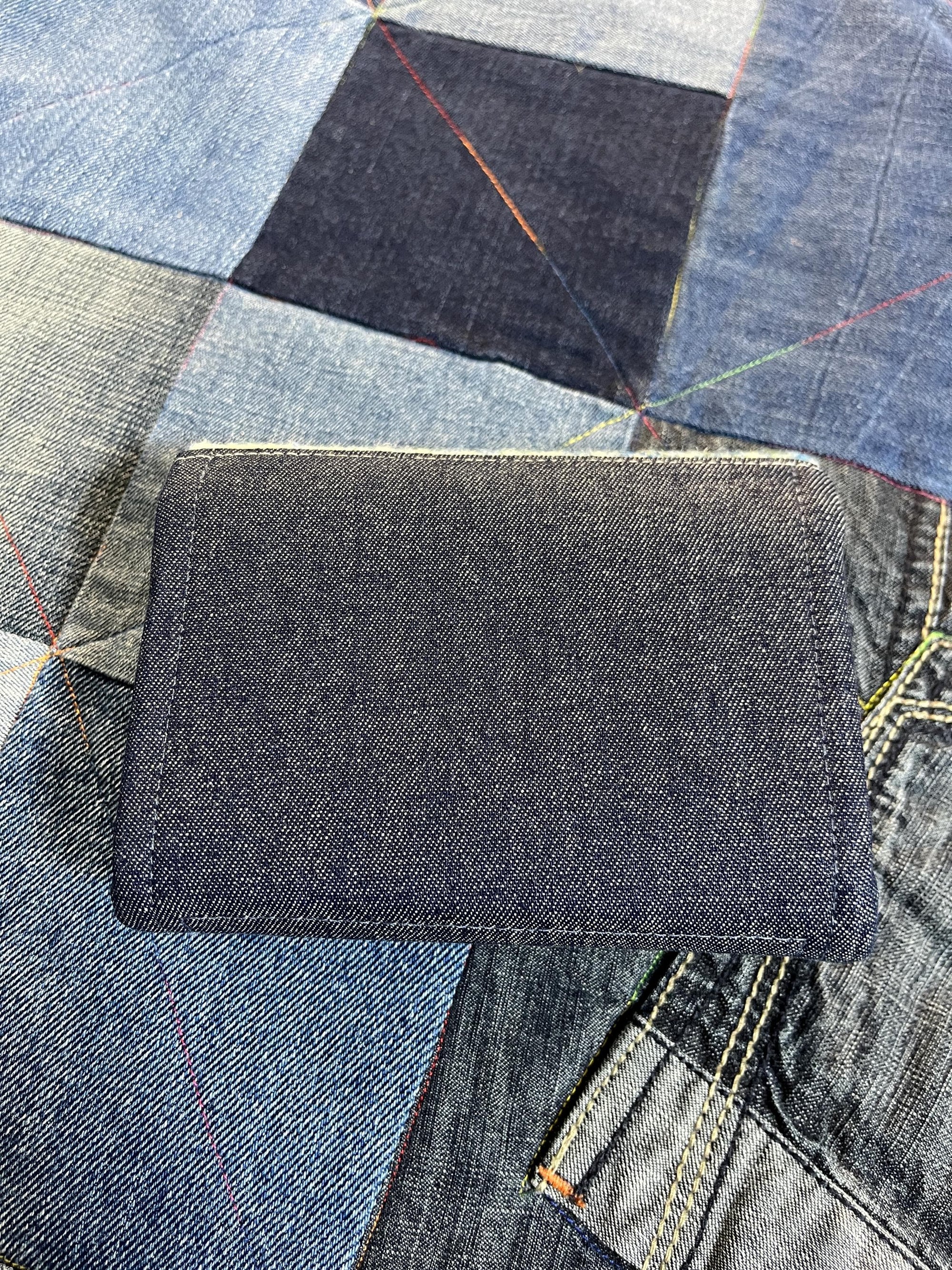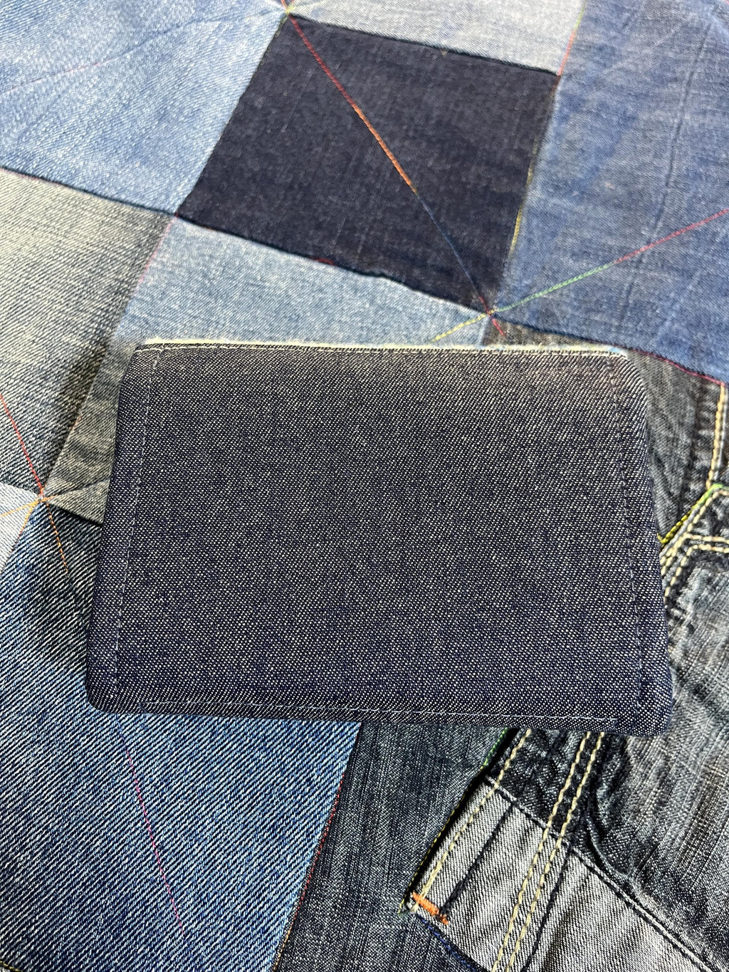 • For this particular purse the body is made from Cotton Denim and the interior from Woven Cotton. The interior fabrics have been especially chosen to complement and enhance the knitted flap design on the outside.
