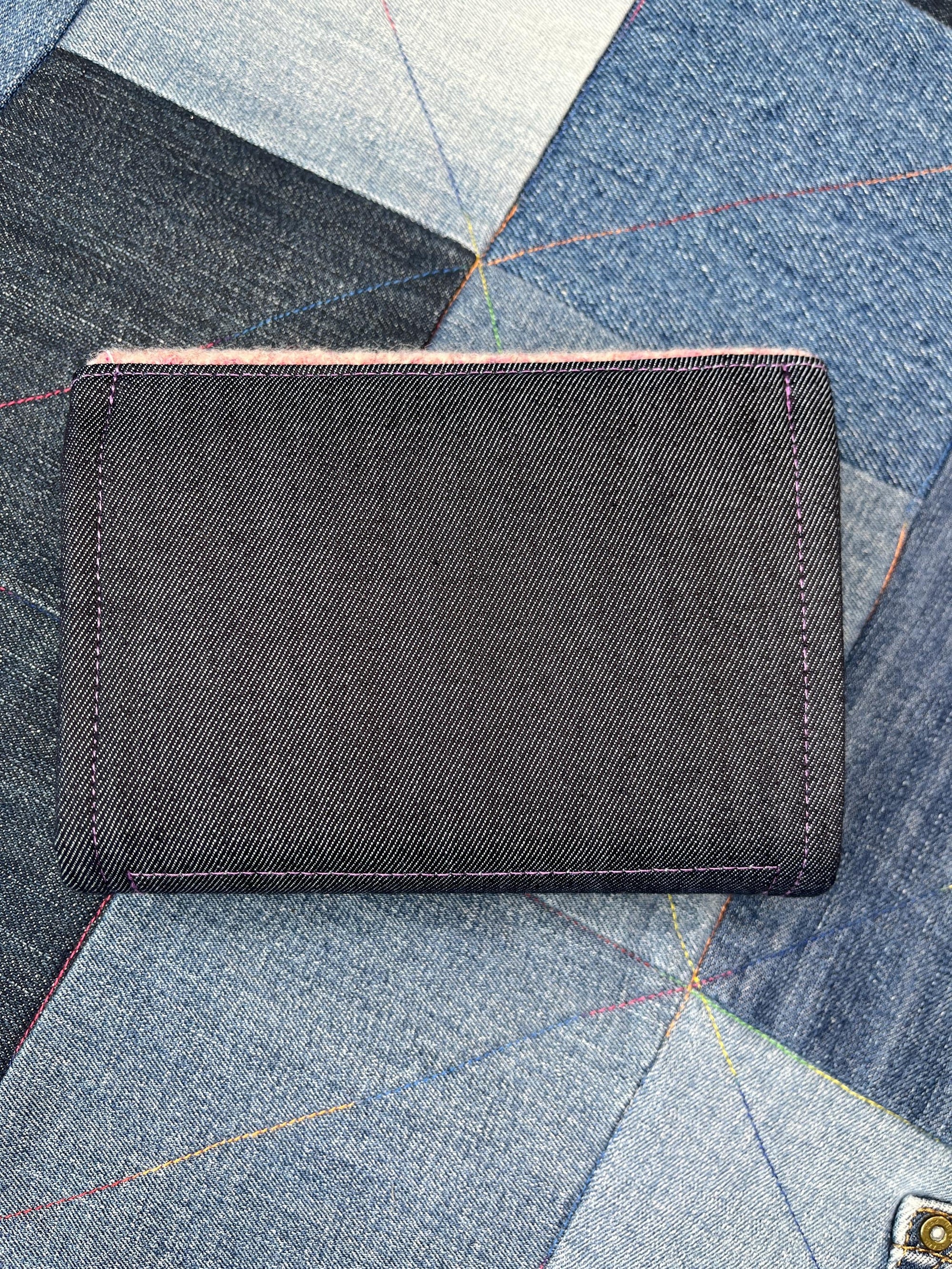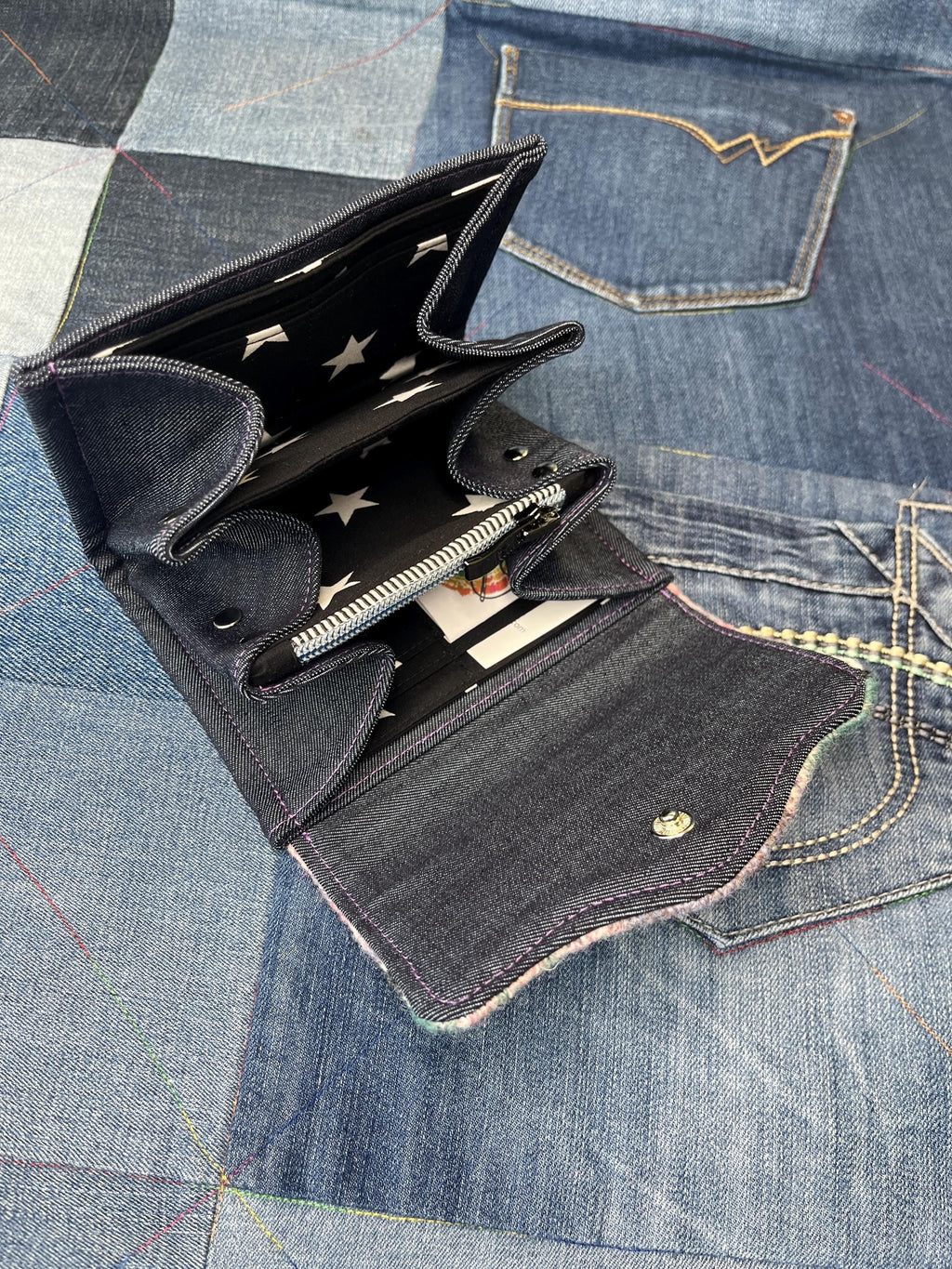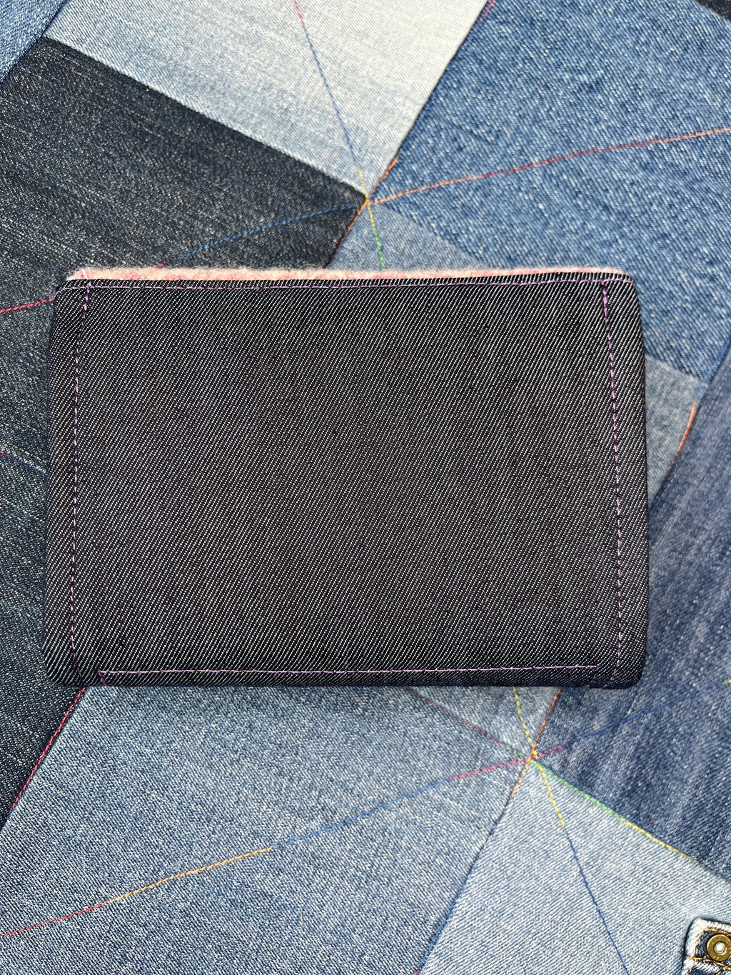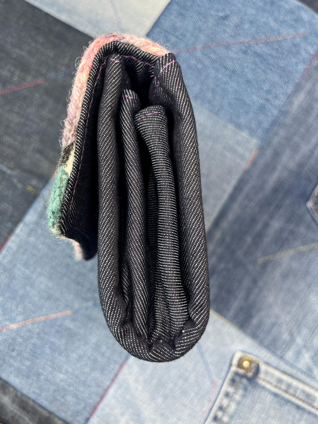 • For this particular purse, the body is made from Cotton Denim and the interior from Woven Cotton. The interior fabrics have been especially chosen to complement and enhance the knitted flap design on the outside.