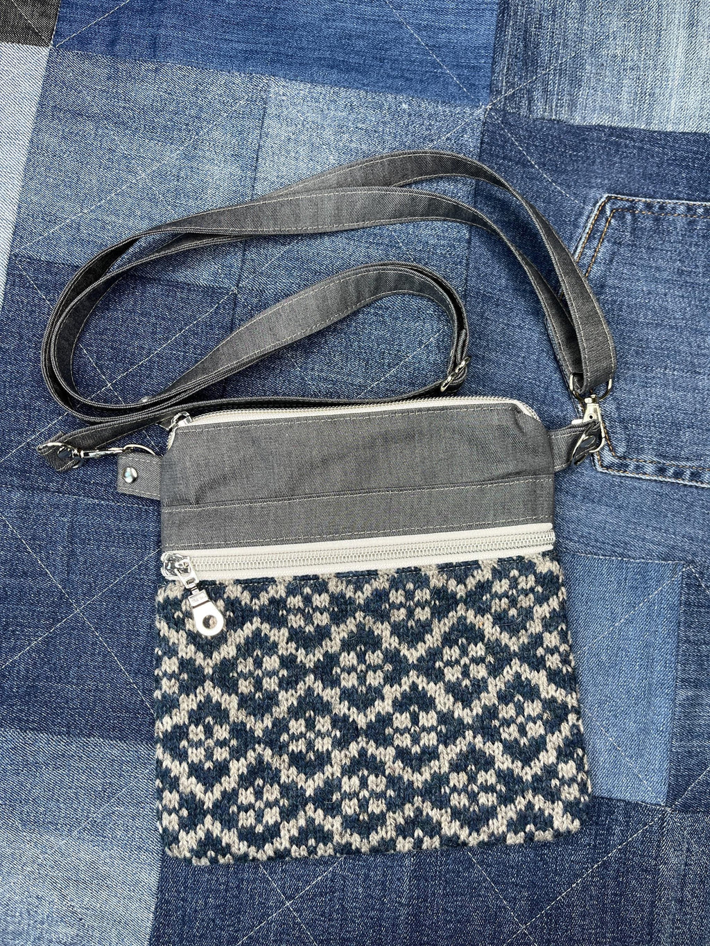 The knitted panel has been knitted using Shetland wool on a vintage knitting machine by a talented local gentleman in Shetland. It features a bright and cheerful blue Fair Isle design that is complemented by the white zip and grey top stitching on the denim.